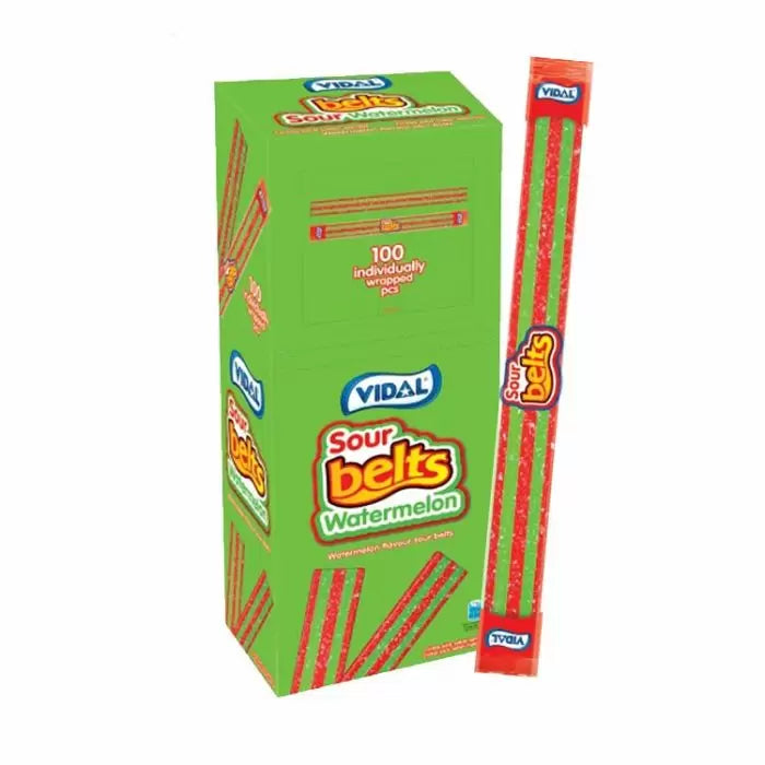 The Vidal Sour Watermelon Belts are delicious red and green watermelon flavour belts with a sour coating! Individually wrapped and provided in a box of 100, these pocket money treats are bound to be a hit with younger customers.